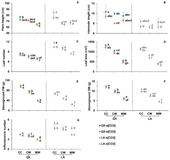 (A) Plant height, (B) internode length, (C) leaf number, (D) leaf area, (E) aboveground fresh weight (aboveground FW), (F) aboveground dry weight (aboveground DW) and (G) inflorescence number of the two tomato genotypes (‘QX’, S. lycopersicum and ‘LA’, S. pimpinellifolium) after the second-round treatments for five days. The treatments, data analysis and presentation are the same as Figure 3.