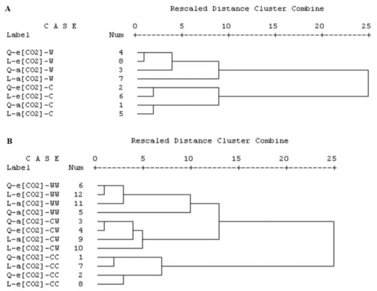 Hierarchical clustering analysis based on Squared Euclidian distance on treatment × parameter matrix of (A) the first and (B) the second rounds of treatments, respectively. Q and L indicated the two tomato genotypes, ‘QX’, S. lycopersicum and ‘LA’, S. pimpinellifolium, respectively. The a[CO2] and e[CO2] indicated 400 and 800 ppm CO2 concentration, respectively. In Figure 6A, the C and W indicated that the plants were at control and waterlogging condition for four days, respectively. In Figure 6B, the ‘CC’, ‘CW’ and ‘WW’ followed by a[CO2] or e[CO2] indicated that the plants were at (1) control condition for both rounds; (2) control followed by waterlogging condition; and (3) waterlogging condition for both rounds, respectively.
