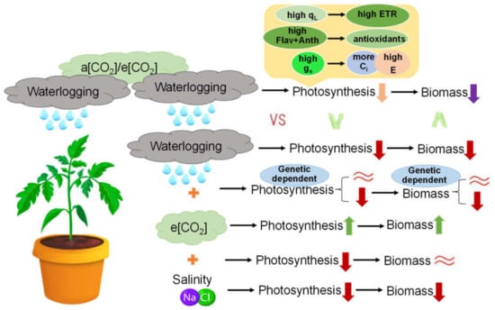- Zhou, R.; Yu, X.; Song, X.; Rosenqvist, E.; Wan, H.; Ottosen, C.-O. Salinity, waterlogging, and elevated [CO2] interact to induce complex responses in cultivated and wild tomato. J. Exp. Bot. 2022, 73, 5252–5263. [Google Scholar] [CrossRef] [PubMed]