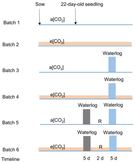 The e[CO2] has diverse ecological and physiological effects on plants that are usually accompanied by other climate change scenarios. The plants growing at e[CO2] may be subjected to various abiotic stresses including waterlogging []. Previous studies mainly focused on exploring the effects of e[CO2] or waterlogging alone on plants [,,,,,]. Only few studies focused on the combined effects of e[CO2] and waterlogging on plants [,], suggesting the need for further studies. The e[CO2] (~760 µmol mol–1) increased the photosynthesis, starch content and biomass of tree Senna reticulata as compared with a[CO2] (~380 µmol mol–1) after 90 days, which played a positive role in alleviating the damage to trees caused by waterlogging for 45 days []. The decrease in photosynthesis was overcome by the e[CO2] (800 µmol mol–1) in three rootstocks of sweet cherry, together with increasing soluble sugars and starch and less intensive stress as indicated by lower proline level than a[CO2] (400 µmol mol–1) for seven days []. By comparison, the effects of e[CO2] on plants at drought stress and drought ‘memory’ are well-documented [,]. Moreover, less studies on the priming and memory effects of waterlogging have been performed [,,], which is an overlooked gap as waterlogging has become one of the most challenging elements of climate change [].