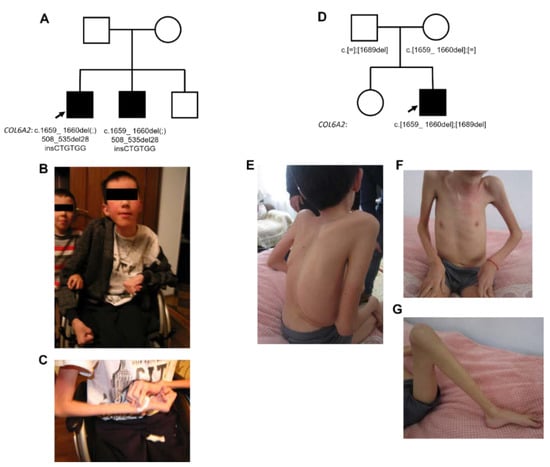 The pedigree of the first family (A) and clinical presentation of the first proband: the patient is non-ambulatory (B), contractures of the wrist and elbow joints, and prominent diffuse atrophy of upper limb muscles (B,C). The second family pedigree (D) and the clinical presentation of the second proband: diffuse muscle atrophy (E–G), prominent kyphoscoliosis with asymmetrical chest deformity (E,F), flexion contractures of the large joints (F,G).