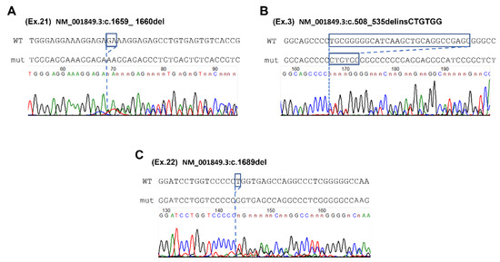 Sanger sequencing of c.1659_1660del variant (spotty blue line indicates deletion site) (A), c.508_535delinsCTGTGG variant (spotty blue line indicates deletion sites) (B), and c.1689del variant (spotty blue line indicates deletion site) (C).