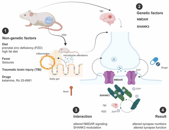 SHANK3 is a major scaffolding protein of the postsynaptic density, whose dynamics can be regulated by zinc. The protein mediates plastic changes in excitatory synapses within the CNS. This becomes evident after brains are subjected to another non-genetic factor: mild traumatic brain injury (mTBI). Urrutia-Ruiz et al. report that mTBI triggered a loss of hippocampal excitatory synapses with a partial time-dependent recovery in wild-type mice. However, in the absence of SHANK3 (using Shank3∆11−/− mice), no significant synaptic alterations were detected due to the lack of structural synaptic plasticity in Shank3 knockout mice [7]. However, these mice had fewer excitatory synapses at baseline. Given that mutations in SHANK3 are linked to ASD, this loss of synaptic plasticity may explain some of the ASD-like behavioral impairments of these mice, such as problems adjusting to new situations and cognitive deficits [7].