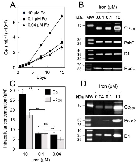 (A) Growth curves for P. tricornutum cultures under different iron concentrations. Mean values ± SD of measurements from 10 independent cultures are presented. (B,D) Representative Western-blots of different photosynthetic proteins in samples of whole cells (B) and membrane extracts (D) from P. tricornutum grown under iron-replete (10 µM iron) and iron-deficient (0.1 or 0.04 µM iron) conditions. MW: molecular weight standard; Cc550 and PsbO, the extrinsic cytochrome c550 and PsbO subunits of PSII; D1, the intrinsic D1 subunit of PSII; RbcL, control with the RuBisCO large subunit. Numbers on the left are the MW values corresponding to the molecular weight standard. Protein extracts: 20 µg for RuBisCO large subunit; 10 µg for PsbO and D1; 2.5 µg for Cc550. Membranes were incubated overnight with the following dilutions of the selected primary antibody: 1:1000 anti-Cc550 and anti-RuBisCO large; 1:2000 anti-PsbO; 1:10,000 anti-D1. The complete Western-blots are shown in Figure S1 (Supplementary Material). (C) Intracellular concentrations of cytochrome c6 (Cc6) and Cc550 measured by differential absorbance changes of P. tricornutum cells grown under different iron concentrations. Data represent mean values ± SD of at least four independent measurements. Double asterisks mark statistically different data groups (p < 0.01); ns = not statistically different.