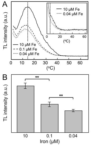 Effect of iron deficiency on the PSII activity of P. tricornutum cells measured by the TL technique. (A) Representative standard TL glow curves, obtained after excitation of P. tricornutum cells with two flashes at 1 °C under different iron concentrations. Inset: TL glow curve of P. tricornutum cells in the presence of 10 or 0.04 µM iron and 20 µM DCMU. (B) Intensities obtained from the component analysis of TL curves from six independent experiments (see also Table 1). Double asterisks mark statistically different data groups (p < 0.01). See the Methods and Materials section for more details.