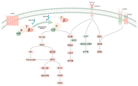 Previous studies showed that the substitution of cysteine at R183 stabilized the inactive GDP-bound Gαq conformation and reduced the hydrolysis of GTP to GDP (Figure 1) [51]. One such study revealed that GNAQ (R183Q) mutations modestly increased the activity of ERK. To further elucidate the underlying mechanism of GNAQ (R183Q) mutations, experiments on these types of mutations were performed in vitro and in vivo [52]. Endothelial colony-forming cell lines were transfected with lentivirus expressing p.R183Q GNAQ (EC-R183Q). Based on bulk RNA sequencing, protein kinase C (PKC), nuclear factor kappa B, and calcineurin signals were activated, and angiopoietin-2 (ANGPT2) was increased. After injecting EC-R183Q in combination with bone marrow mesenchymal progenitor cells under the skin of nu/nu mice, enlarged blood vessels that resembled CMs were formed. Furthermore, the suppression of ANGPT2 could prevent the enlargement of vessels.