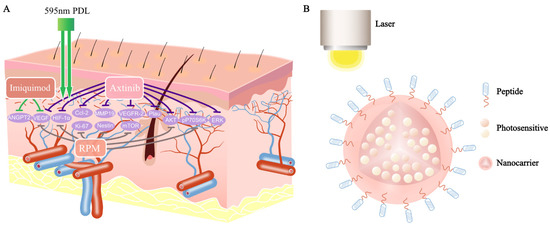Antiangiogenic agents combined with PDL and a novel PDT for treatment of PWSs: (A) axitinib inhibits the mRNA levels of HIF-1α, VEGF, Ccl2, Plau, and MMP19 increased by PDL. In addition to this, it also blocks PDL-induced pERK, pAKT, and pP70S6K. The expression of VEGF and ANGPT2 decreased in the PDL combined with the imiquimod sample, compared with PDL alone. RPM inhibits the PDL-induced expression of Ki-67, nestin, HIF-1α, VEGF, P70S6K, etc.; (B) a novel PDT for treatment of PWSs: photosensitizers (ICG, IR-780, IR-783) are encapsulated inside nanocarriers, which are conjugated with special markers (CD133/CD166/EphB1/EfnB2/VEGFR-2).