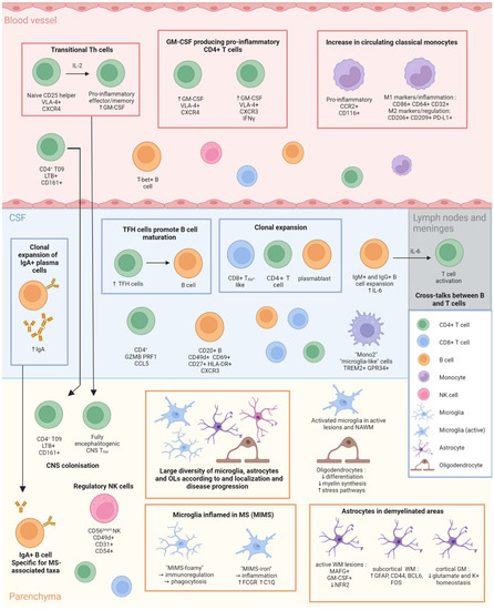 In addition to these major immune cell subsets, others are described to be involved in the pathology of MS, such as NK cells, innate lymphoid cells and dendritic cells. Moreover, other specific cells of the CNS may also be actors in this pathological process, such as microglial cells, oligodendrocytes and astrocytes.