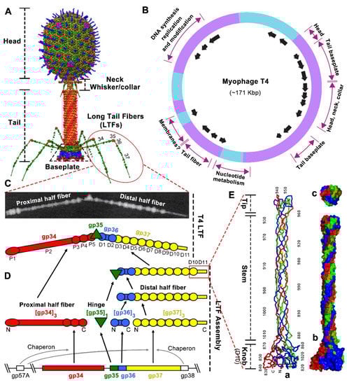 - Hyman, P.; van Raaij, M. Bacteriophage T4 long tail fiber domains. Biophys. Rev. 2017, 10, 463–471. [Google Scholar] [CrossRef] [PubMed]