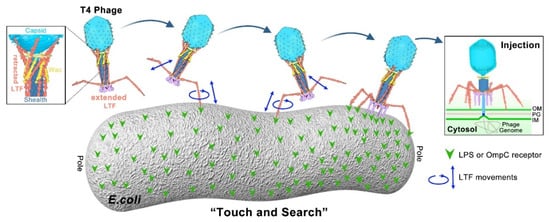 Since there are a number of receptor-binding patches on the T4 LTF “tip” and abundant LPS or OmpC receptors on the host surface, a collision between the “tip” and the receptor should be relatively frequent. The first specific recognition involves a single extended LTF bound to its receptor LPS or OmpC. The initial temporary interaction prevents phage diffusion and hinders the bound tail fiber from returning to be retracted []. Additionally, the trimeric “tip”, having symmetrical and diverse binding patches, allows weak and unstable interaction with the receptor in several locations along its length. As a result, the “tip” might move up and down as well as rotationally like a molecular pivot []. Then, a second extended LTF binds to another receptor on the surface before the first one has dissociated and/or retracted. Both “association–dissociation” of receptor–LTF and “extended–retracted conformation” of LTF is likely in a dynamic equilibrium. Repeating these dynamic processes allows the T4 phage to randomly walk across the bacterial surface to search for an optimal site before committing to infection. These continuous “touch and search” efforts of the phage finally lead to the discovery of the optimal site for efficient infection, such as a cell pole or an invagination of an upcoming division site for T4 phage (Figure 3) [,].