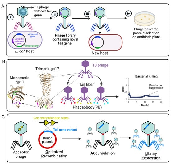 Representative engineering strategies of phage tail fiber. (A) GoTrap model []: (i) T7 phage without a tail fiber gene infects E. coli carrying a plasmid with antibiotic resistance marker, a T7 packaging signal, and various tail components. (ii) The new phage contains a different tail fiber (iii) that can recognize a new host for plasmid transduction. (iv) A new host containing the phage-transduced plasmid is selected on an antibiotic plate. (B) Phagebody model: The loop region (tip) of T3 phage gp17 for random mutagenesis is marked by magenta, green, yellow, and red. The selected phageobody can suppress bacterial growth []. (C) ORACLE method: An acceptor phage is generated in which the tail fiber gene is replaced with a fixed sequence flanked by CRE recombinase sites (a landing site for inserting tail variants) (yellow). The phage variants are then generated within the host by Cre-mediated optimized recombination by inserting tail fiber variants from a donor plasmid (blue, containing single amino acid substitution) into the landing sites []. Created by BioRender.com.