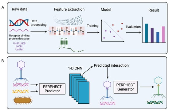Schematic representation of the machine learning model. (A) The raw data (DNA and RNA sequences) of the receptor binding protein database are used to extract features. Next, the features are fitted into different machine learning models, which are evaluated to predict the best result. (B) Representation of PERPHECT model; phage and bacterial genetic information are used by the PERPHECT model and PERPHECT generator to provide guidance for genomic modification of the existing phage []. Created by BioRender.com.