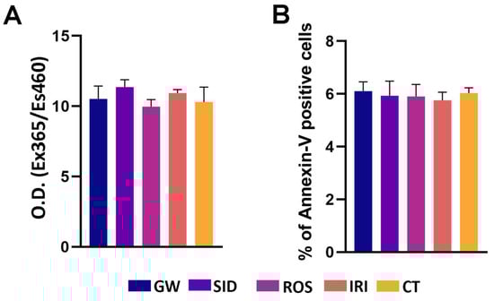 Senescence, and apoptosis detection. (A) Senescence evaluation in white adipocytes by 4-methylumbelliferyl-β-d-galactopyranoside (MUG) quantitative fluorescent assay following seven days of drug treatment. The 4-MUG is a β-galactosidase substrate that emits fluorescence when the enzyme converts it into fluorophore 4-methylumbelliferone. The fluorophore was detected with an excitation/emission wavelength of 365/460 nm. The data are expressed as arbitrary units (±SD, n = 3 biological replicates). The MUG assay detects the activity of senescence-associated beta-galactosidase (SA-β-gal) at pH 6.0, while, physiologically, beta-galactosidase is active at pH 4.0, the typical lysosomal acid environment. (B) Apoptosis analysis in white adipocytes by the fluorescein-conjugated Annexin V assay following seven days of drug treatment. The Annexin V assays detect the phosphatidylserine sites on the membrane surface of apoptotic cells by immunofluorescence staining. The graph shows mean expression values in cells treated with browning agents after white adipogenic differentiation (±SD, n = 3 biological replicates). GW: GW501516; SID: sildenafil; ROS: rosiglitazone; IRI: irisin; CT: differentiated white adipocytes without analyzed drugs. Drug concentration: 1 nM (GW); 1 nM (SID); 43 nM (ROS); 20 nM (IRI).