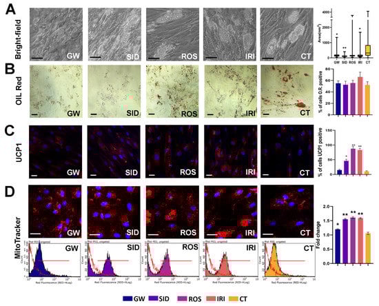 In our previous study, we identified the markers for white and brown MSC differentiation: white adipocytes showed high levels of CEBPA, PPARG, and LPL mRNAs, while brown adipocytes showed an increase in PPARG, LPL, and UCP1 mRNAs. This result indicates that the expression profiles of white and brown adipocytes contain both common (PPPARG, LPL) and specific markers, CEBPA and UCP1, respectively []. In this framework, our data reveal that SID, ROS, and IRI exhibited a browning effect by promoting strong UCP1 upregulation, while GW did not show a significant influence on UCP1 levels (Figure 3A).