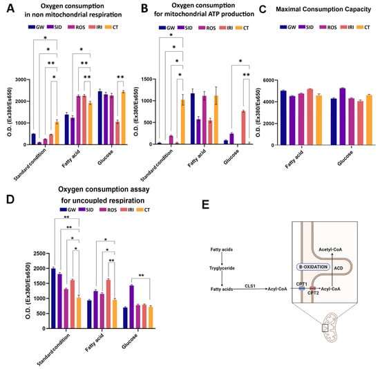 To gain more insight into these processes, we grew white adipocytes in media supplemented with a single nutrient (fatty acid or glucose) and then evaluated mitochondrial oxygen consumption, since it is well-known that thermogenic adipocytes (brown and beige cells) manage lipid and glucose homeostasis in order to modulate body temperature. Heat production, or thermogenesis, is a powerful energetic mechanism, and brown adipocytes need a fast and accessible power source, represented principally by glucose and/or free fatty acids [,]. Our results were consistent with the findings reported in the literature: in the presence of glucose, we observed an increase in mitochondrial oxygen consumption, primarily after treatment with GW, SID, and IRI (Figure 4B). In contrast, the sole presence of fatty acid in the media did not induce a significant variation of oxygen consumption among various treatments, compared with the control (Figure 4B).