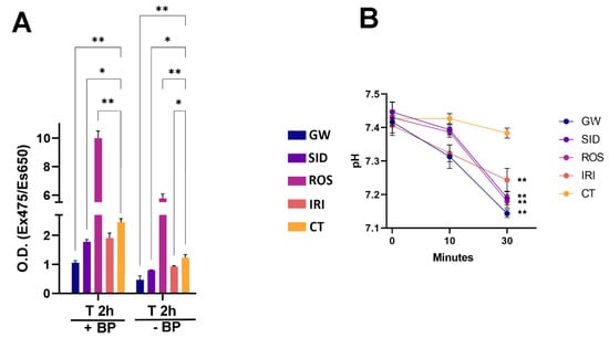 Uptake and release of FFAs in MSCs treated with browning agents after white adipogenic differentiation. (A): the cells were serum-starved for 16 h, then treated with 10 µM BODIPY FL C16 for 2 h in DMEM (T 2 h + BP). Subsequently, cultures were incubated for 2 h (T 2 h w/o BP) with complete medium (DMEM containing 10% FBS) without BODIPY FL CL16. The histogram shows the uptake levels of palmitate in different experimental conditions. (B): Cells were incubated in KREBS buffer with 2%BSA for 10 min, then the pH of the medium was evaluated at 10 and 30 min following the addition of 0.5 µg/mL epinephrine in the medium. Data are expressed as optical density (O.D Ex475/Es650 nm) (±SD, n = 3 biological replicates; * p < 0.05, ** p < 0.01). GW: GW501516; SID: sildenafil; ROS: rosiglitazone; IRI: irisin; CT: differentiated white adipocytes without analyzed drugs. Drug concentration: 1 nM (GW); 1 nM (SID); 43 nM (ROS); 20 nM (IRI).