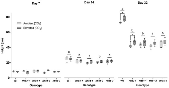 The effect of high CO2 on plant height in wild type peas and mutants defective either in strigolactone (SL) synthesis (rms1-2 and rms5-3) or signaling (rms3-1 and rms4-1). Plants were grown for up to 32 days either under ambient (420 ppm) or high CO2 (750 ppm). Different letters indicate a statistically significant difference (p < 0.05) between genotype at each time point, while a significant difference between [CO2] within genotype is indicated by an asterisk (p < 0.05). Day 7 and day 14, n = 6; day 32, n = 7. Mean indicated as +.