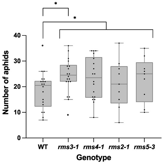 Aphid fecundity on wild type peas and mutants defective either in strigolactone (SL) synthesis (rms1-2 and rms5-3) or signaling (rms3-1 and rms4-1) grown under ambient CO2 conditions. A single pea aphid nymph was placed on each 5-day-old plant. Plants were then grown in air for 15 days before aphid numbers were counted. Significant differences between genotypes are indicated as: * p < 0.05. Strigolactone mutants as a group were also significantly different from the wildtype. Wildtype (WT) and rms3-1, n = 19; rms4-1, n = 18; rms2-1 and rms5-3, n = 9.