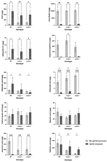 The effect aphid infestation on the levels of different phytohormones in wild type peas and mutants defective in strigolactone signaling (rms3-1 and rms4-1) under high CO2 growth conditions. Data shown as mean ± SD (n = 3). Different letters indicate a statistically significant difference (p < 0.05) between genotype means (aphid-exposed and non-exposed grouped), while a significant difference between aphid exposure groups within genotype is indicated as: * p < 0.05; ** p < 0.01; *** p < 0.001; **** p < 0.0001.