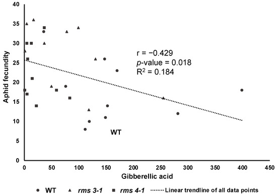The number of aphids on each plant was significantly correlated (p = 0.018) with shoot gibberellic acid concentration (ng/g DW) with a single relationship explaining variation across all genotypes (n = 30, n = 10 per genotype).
