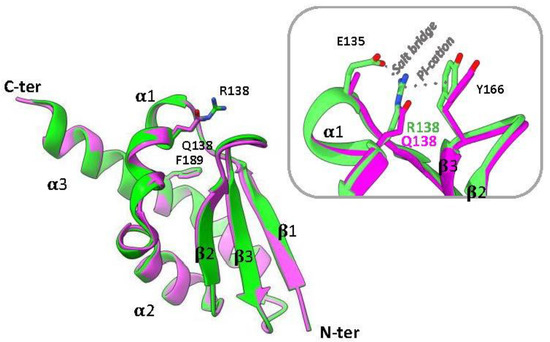 Figure 1. Superposition of the three-dimensional structure of the KH0 (green) and KH0-R138Q domain (magenta) of FMRP represented as a cartoon (from pdb codes 4QVZ and 4QW2, respectively). The residues Arg138/Gln138 and Phe189 are shown in stick representation. Secondary structure elements are labeled. The blow-up shows that Arg138 engages in a salt bridge with Glu135 and makes a Pi-cation interaction with Tyr166.