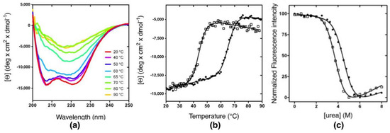 50. Santoro, M.; Bolen, D.W. Unfolding Free Energy Changes Determined by the Linear Extrapolation Method. 1. Unfolding Phenylmethanesulfonyl a-Chymotrypsin Using Different Denaturants. Biochemistry 1988, 27, 8063–8068. [Google Scholar] [CrossRef] [PubMed]
