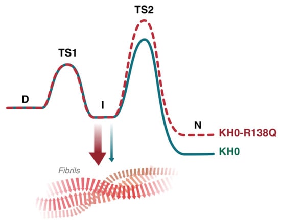 Figure 6. Proposed model for the enhanced aggregation propensity of KH0-R138Q mutant. In the case of KH0-R138Q mutant, a more populated intermediate state (I), due to a higher energy barrier between the I and N state (TS2), could facilitate KH0-R138Q reaching the fibrillar state. It cannot be excluded that the destabilization of the native state of KH0-R138Q with respect to KH0 (N) also plays a role in the fibrillogenesis process.