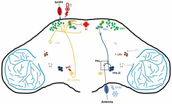 The antenna is a temperature-sensing organ containing a variety of sensory structures that allow Drosophila to detect temperature changes [99]. Each arista contains brav1- and Gr28b-positive neurons that sense cold and heat [71,100]; temperature signals are transmitted by these cells to different regions of the proximal antennal protocerebrum [64,101], and then to the mushroom body [102]. In the absence of thermosensitive cells in the antenna, the normal response of DN1 neurons is attenuated, leading to disruption of sleep timing during temperature cycling [33]. Temperature signals are transmitted by pyx-expressing neurons in the antenna to ACs and then to the posterior antennal lobe [64,96], which integrates temperature-related information for transmission to higher brain centers.