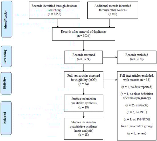 - Gao, M.; Jiang, X.; Li, B.; Li, L.; Duan, M.; Zhang, X.; Tian, J.; Qi, K. Intrauterine Injection of Human Chorionic Gonadotropin before Embryo Transfer Can Improve in Vitro Fertilization-Embryo Transfer Outcomes: A Meta-Analysis of Randomized Controlled Trials. Fertil. Steril. 2019, 112, 89–97.e1. [Google Scholar] [CrossRef] [PubMed]