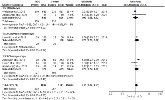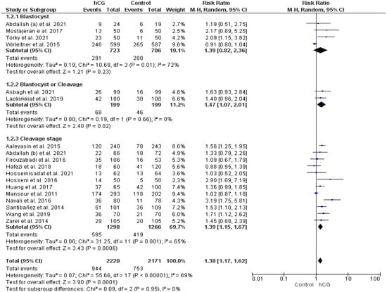 | Hosseinisadat et al., 2021 [27] | Iran | N = 126 <40 years old | n = 62 1000 IU of hCG | n = 64 No intervention | Cleavage stage |