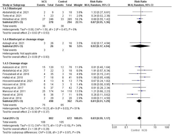 | Navali et al., 2016 [41] | Iran | N = 158 ≤41 years old | n = 80 500 IU hCG in up to 0.5 mL normal saline, immediately after oocyte retrieval | n = 78 0.5 mL normal saline, immediately after oocyte retrieval | Cleavage stage |