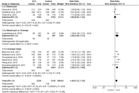 | Mansour et al., 2011 [39] | Egypt | N = 445 <40 years old | n = 243 100 IU of hCG vs. 200 IU of hCG vs. 500 IU of hCG, 7 min before ET | n = 202 No intervention | Cleavage stage |