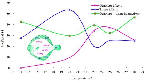 The contribution trends of the three effects are shown in Figure 2. The contribution of the genotype effect slowly increased with increasing temperature; it increased faster at 20 °C and then slowly declined at 25 °C. The contribution of the tissue effect slowly increased from 14 °C to 20 °C, where it sharply decreased, and then it stabilized after a slight fluctuation. The contribution of the genotype × tissue interaction effect showed a fluctuating upward trend throughout the experiment, and it had a significant impact on PPAR gene expression.