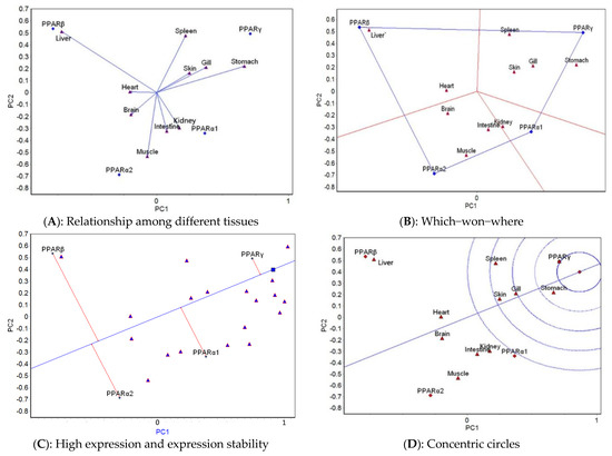 At 23 °C, the relationship among different tissues (Figure 5A) showed that the angles between the heart and gill and between the spleen and stomach were the smallest, which indicated that the ranking of gene expression was the same for each pair of tissues. The gill had the longest line segment length, indicating that it had the strongest ability to distinguish the expression of the four genes. The which-won-where view (Figure 5B) showed that the 10 tissues were divided into two regions: the spleen and stomach belonged to one area, and the other eight tissues belonged to another area. The expression of PPARγ was the highest in the spleen–stomach region, and PPARα1 expression was the highest in the other area. The high expression and expression stability biplot (Figure 5C) showed that the expression of PPARα1 was the highest, followed by PPARγ, PPARα2, and PPARβ; PPARα2 had the most stable expression, followed by PPARβ, PPARα1, and PPARγ. The GGE biplot with concentric circles (Figure 5D) showed that PPARα1 had the best expression and stability, followed by PPARγ, PPARα2, and PPARβ.