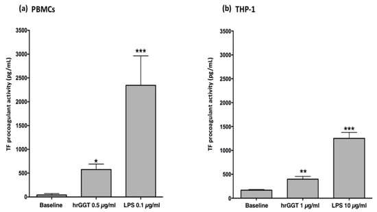 For the procoagulant activity test, 4 × 105 cells were incubated at 37 °C for 4 h with 1 µg/mL hrGGT or 10 µg/mL LPS as a final concentration in the medium. It should be noted that THP-1 required an hrGGT and LPS concentration for cells stimulation twice as high as that used in PBMCs []. This different behavior agrees with the literature data showing a lower sensitivity of THP-1 compared to the sensitivity of PBMCs in response to LPS. The longer incubation time of PBMCs compared to that of THP1 cells was due to the delayed delivery of buffy coats from the blood bank, which did not allow completing the experimental procedures in the same day. In preliminary experiments, PBMCs responses to hrGGT tested after 4 and 18 h incubation did not differ. Thus, the cells treated were then subjected to the evaluation of TF procoagulant activity using a STart Max semi-automated Coagulation analyzer.
