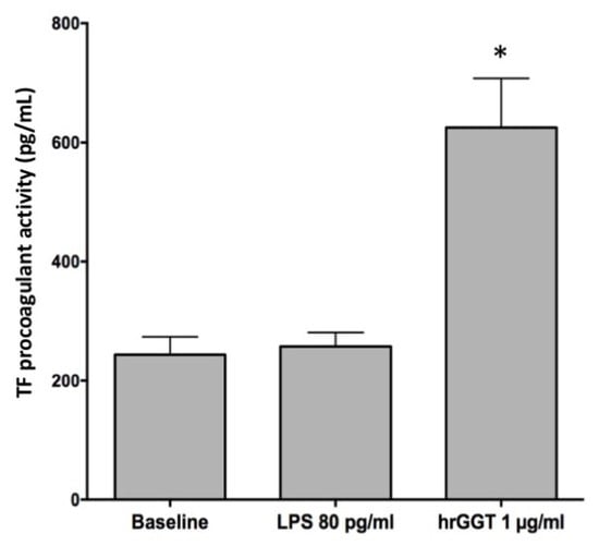 TF procoagulant activities measured in THP-1 cells stimulated by hrGGT (1 µg/mL) and LPS (80 pg/mL). Data are presented as means ± SEM (n = 3). * p < 0.05 vs. LPS. A multiple comparison was performed by the Friedman test.