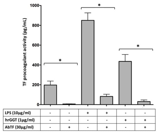 TF procoagulant activities measured in THP-1 cells stimulated by hrGGT (1 µg/mL) and LPS (10 µg/mL) in the presence or absence of an anti-TF antibody (30 µg/mL). Data are presented as mean ± SEM (n = 3). * p < 0.05. The Wilcoxon test was used.
