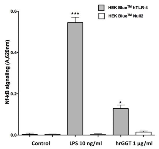 NF-κB quantification in HEK-Blue hTLR4 and HEK-Blue Null2 cells stimulated with 1 µg/mL hrGGT for 18 h at 37 °C and at an atmosphere of 5% CO2. hrGGT induced NF-κB in HEK-Blue hTLR4 cells, but not in HEK-Blue Null2 cells which lacked TLR4 receptor. LPS (10 ng/mL), the selective agonist of TLR4s, was used as a positive control. *** p < 0.001 vs. control; * p < 0.05 vs. control. Data are presented as mean ± SEM (n = 3). The relative expression level of SEAP (directly proportional to Nκ-kB activity) was determined spectrophotometrically at 620 nm.