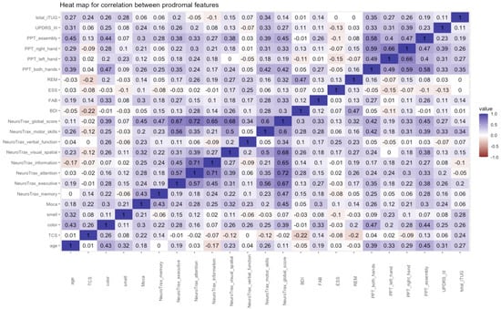 A correlation matrix was constructed to assess correlations among the different prodromal features (Figure 1). Strong correlations were found within the NeuroTrax tests and within the Perdue pegboard tasks. Moderate correlations were seen between the NeuroTrax and color, MoCA, and the different motor tests. Poor correlation was seen between the two sleep assessment tests (r = 0.13).