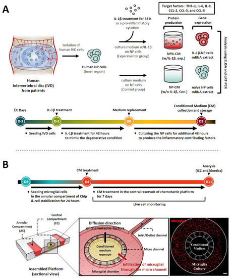 Schematic of stepwise experiment set-up and timeline for replication of interactions between human NP cells and microglia using a microfluidic chemotaxis platform. (A) Following initial injury, human NP cells are stimulated by pro-inflammatory cytokines IL-1β, inducing the secretion of diverse inflammatory mediators and chemokines. Thus, we evaluated the protein production and gene expression of these factors, including TNF-α, IL-6, IL-8, and CCLs. (B) In the second phase, the degenerative microenvironment of human NP cells can permit the infiltration and activation of immune cells, such as microglia, which are believed to be responsible for neuro-inflammation. Thus, we assessed the microglia’s chemotaxis and its activation using a microfluidic chemotaxis platform. The platform is composed of two major units, including a central compartment (CC) and an annular compartment (AC), connected by thin microchannels. The fluorescence image shows the experiment set-up on the platform for the microglia chemotaxis study. Scale bar, 500 μm.