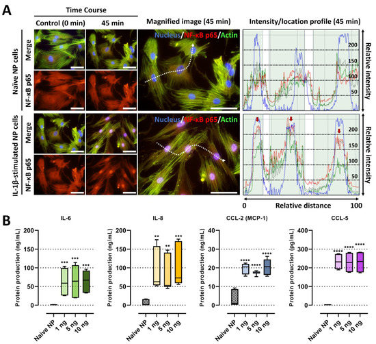 IL-1β stimulation on human NP cells for degenerative IVD conditions. (A) Fluorescence image and quantification of the fluorescence intensity of NF-κB p65 protein in human NP stimulated by recombinant IL-1β 10 ng/mL. The red arrow indicates the preferential distribution of NF-κB p65 protein in the nucleus. Scale bars, 100 μm. (B) The protein production of IL-6, IL-8, CCL-2 and CCL-5 on human NP cells with/without IL-1β treatment in a dose-dependent manner. The values are reported as the mean ± standard error of four independent experiments. Scale bars, 225 μm. ** p < 0.01, *** p < 0.001, and **** p < 0.0001 as compared with naïve NP cells.