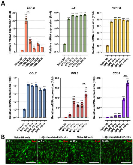 IL−1β stimulation induces the gene expression of inflammatory mediators and chemokines on human NP cells. (A) Comparison of gene expression for inflammatory cytokines and chemokines from human NP cells with/without IL−1β treatment in a time-dependent manner. (B) Assessment of cytotoxicity by using Live/Dead assay. The results showed that human NP cells treated with IL−1β did not exhibit any difference in cell viability. The values are reported as the mean ± standard error of four independent experiments. Scale bars, 225 μm. * p < 0.05, ** p < 0.01, and *** p < 0.001 as compared with naïve NP cells. The line indicates the comparison with each group.