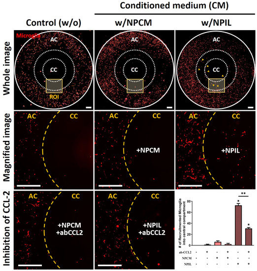 Recruitment of microglia using conditioned medium derived from IL−1β−stimulated human NP cells. Significant recruitment of microglia is observed in the central compartment (CC) containing NPIL (conditioned medium of IL−1β−stimulated NP cells) from the annular compartment (AC). Additionally, results show that neutralizing CCL−2 reduced the chemotaxis effects on microglia. Scale bars, 500 μm. *p < 0.05, **p < 0.01 as compared with naïve microglia cells. The line indicates the comparison with each group.
