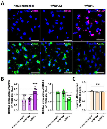 Fluorescence images and quantitative results revealed that CD11b protein in microglia was upregulated in the presence of NPIL, whereas CD206 protein was downregulated in the condition, compared with both naïve and NPCM-treated microglia (Figure 5A,B). Similar to the IL-1β experiment, because the treatment of NPCM or NPIL can damage the microglia, we assessed cell cytotoxicity using LDH assay. neither NPCM nor NPIL exhibited significant toxicity to microglia. Microglia cultured in NPCM or NPIL did not exhibit any difference in cell cytotoxicity compared with naive microglia (Figure 5C).