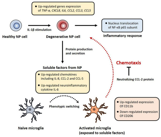 Our data demonstrated that soluble factors derived from degenerative human NP cells induced by IL-1β stimulation serve as recruiting signals during the recruitment of microglia. In particular, the chemoattractant CCL-2 directly caused microglial migration in response to soluble factors from degenerative human NP cells (Figure 6).