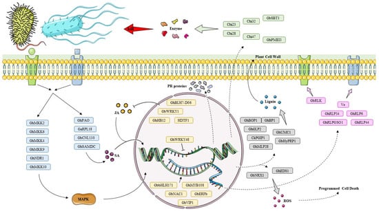 Activation of plant innate immunity requires receptor recognition of pathogens. MTI/PTI is triggered by PRRs located across the cell surface, whereas ETI is caused by NBS-LRR receptor proteins located intracellularly []. PRRs include receptor-like proteins (RLPs) and receptor-like kinases (RLKs) that are located on plant cell membranes and which are responsible for detecting molecular markers of invading pathogens or damaged plant tissues and activating defense responses, thereby preventing infection before pathogen invasion of the plant cell [,]. The GhRLPGSO1-like gene, GhRLP44, GhRLP6, and GhRLP34 may play a role in resistance to Fusarium cotton wilt []. Verticillium wilt infestation of disease-resistant G. barbadense cotton induces GbRLK; transfection of cotton and Arabidopsis with this gene increases resistance to Verticillium wilt []. The TIR-NBS-LRR protein encoded by CG02 is likely to be a key gene for resistance to Verticillium cotton wilt since it specifically promotes the expression of disease resistance genes, while silencing this gene increases its susceptibility to Verticillium wilt [].
