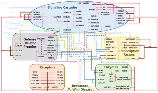 Expression of ribosomal protein GaRPL18 is induced by SA treatment, suggesting that GaRPL18 is associated with SA-mediated signaling pathways. Silencing GaRPL18 significantly reduces the number of immune molecules induced by the SA signaling pathway and reduces Verticillium wilt resistance in cotton, whereas GaRPL18 overexpression increases plant resistance to Verticillium wilt []. Expression of cotton cyclin-dependent kinase E (GhCDKE) is induced by Verticillium wilt infestation and methyl jasmonate (MeJA); GhCDKE silencing in cotton increases vulnerability to Verticillium wilt, whereas its overexpression in Arabidopsis enhances resistance []. The JA-induced calcium-dependent protein kinase GhCPK33 negatively regulates resistance to Verticillium cotton wilt, and knockdown of GhCPK33 enhances resistance []. The expression of GhIQM1 Ca2+-independent calmodulin-binding protein is induced by V. dahliae and SA, which may negatively regulate resistance to Verticillium cotton wilt by inhibiting the SA pathway []. GhBIN2 interacts with JAZ (jasmonate-ZIM domain) family proteins and phosphorylates JAZ proteins in response to infestation by V. dahliae. This may negatively regulate resistance to Verticillium cotton wilt by regulating the JA signaling pathway, since GhBIN2 overexpression in cotton increases sensitivity to Verticillium wilt [].
