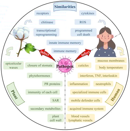 Similarities and differences in the resistance of plants (cotton) and humans to Fusarium. Blue represents the similarities between the defense mechanisms of plants and humans; green and yellow represent the respective characteristics of plants and humans. This cover has been designed using images from Freepik.com.
