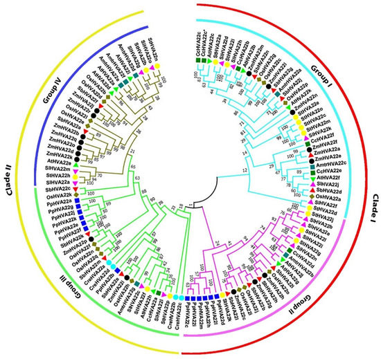 We identified 15 HVA22 tomato genes and designated them as HVA22a–HVA22o based on their chromosomal locations. The characteristics of SlHVA22 genes and their corresponding proteins are presented in Table S1. The protein sequence identity ranged from 10% to 73% among SlHVA22 proteins, and the proteins that were clustered in the same phylogenetic groups had higher sequence identities than those from different groups (Table S2). The phylogenetic analysis classified diverse plant HVA22 family proteins into two major clades, which were further divided into four groups according to their phylogenetic relationship (Figure 1).