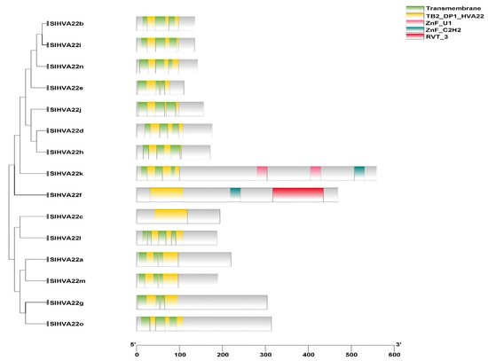Schematic depiction of the domain organization of SlHVA22 proteins. The transmembrane domain, TB2/DP1/HVA22 domain, U1-type zinc finger (ZnF_U1) domain, the classical C2H2 zinc finger (ZnF_C2H2) domain, and the RVT_3 domain identified in SlHVA22 proteins are shown.